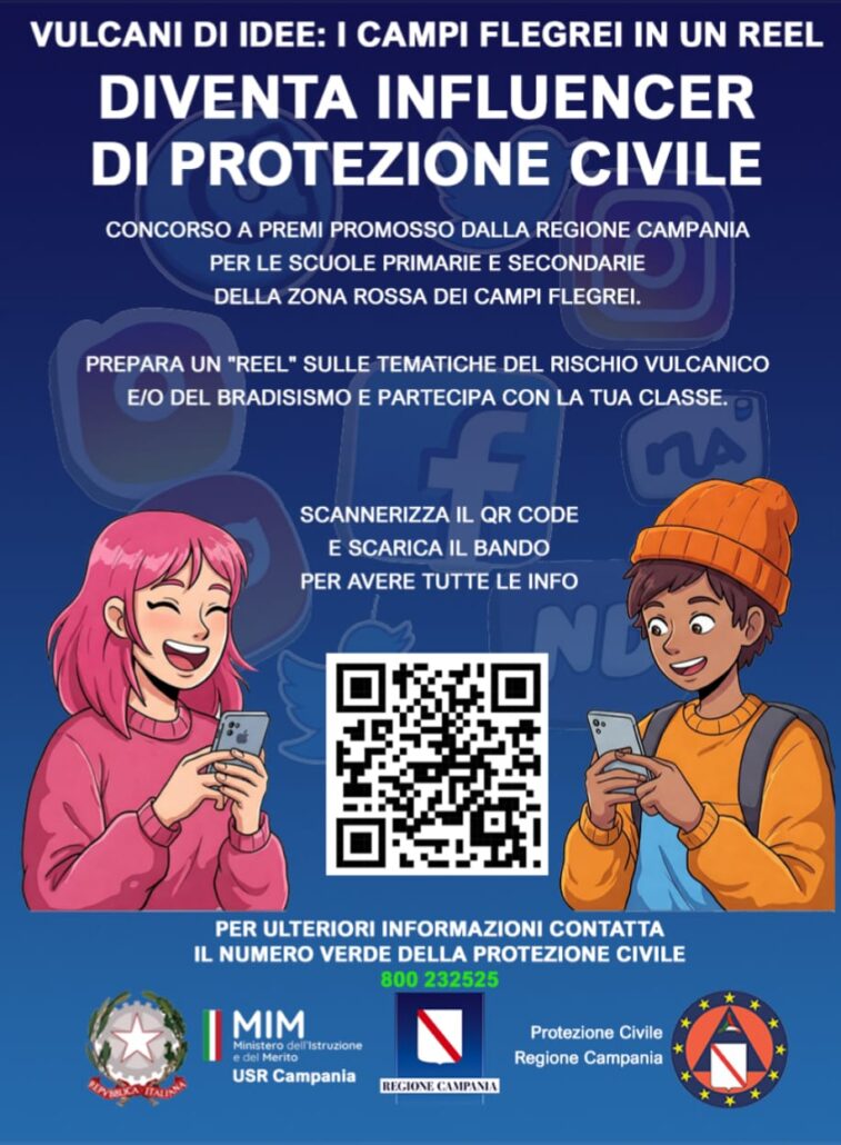 La Regione Campania ha promosso un contest per tutte le scuole primarie e secondarie (di primo e secondo grado) della Zona Rossa dei Campi Flegrei denominato “Diventa un influencer di protezione civile – vulcani di idee: i Campi Flegrei in un reel”.